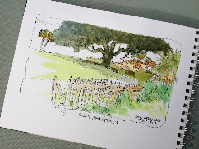 Week of Feb. 9...Started the week in Winter Haven for a three day session ...weather was in the 70's and sunny. First day at Lake Alfred, Wednesday at Bok Tower - the highlight of my trip, so far!...absolutely stunning structure with beautiful gardens...constructed in Art Deco period by Edward Bok... What a day! Thursday was at the downtown park, where I got a demo finished, just ahead of a shower which lasted rest of the day.The class finished up at a coffee shop...St Augustine was a single day's visit, on a very cold windy day...50 degrees, so I did the one sketch and a number of pix... On to Palm Coast...